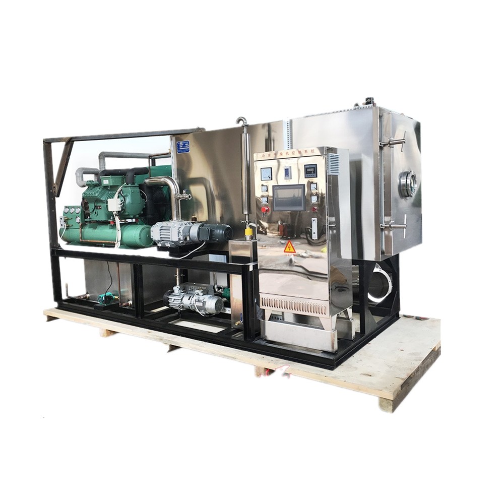 ফ্রিজ ড্রায়ার একটি রেফ্রিজারেশন সিস্টেম, একটি ভ্যাকুয়াম সিস্টেম, একটি হিটিং সিস্টেম এবং একটি বৈদ্যুতিক যন্ত্র নিয়ন্ত্রণ ব্যবস্থা নিয়ে গঠিত।প্রধান উপাদানগুলি হল ওভেন, কনডেনসার, রেফ্রিজারেশন ইউনিট, ভ্যাকুয়াম পাম্প, হিটিং/কুলিং ডিভাইস।এর কার্যকারী নীতি হল উপাদানটিকে একটি নির্দিষ্ট তাপমাত্রার নিচে হিমায়িত করা এবং তারপরে ভ্যাকুয়ামের অবস্থার অধীনে জলের কঠিন অবস্থা (বরফ) সরাসরি জলীয় বাষ্পে পরিণত হয় এবং শুকনো আইটেমগুলি পেতে নিঃসৃত হয়।